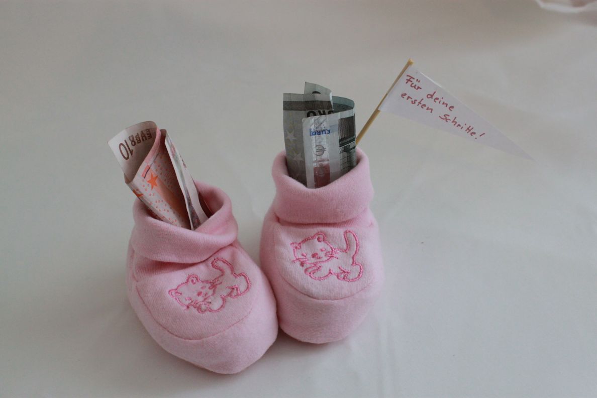 Aus zwei Geldscheinen werden kleine Schuhformen gefaltet, die wie winzige Babyschuhe aussehen. Zusammen mit passenden Bändern oder einer kleinen Geschenkbox ergibt das eine charmante Möglichkeit, Geld in Form von Mini-Schuhen zu präsentieren – z. B. zur Geburt oder Babyparty.