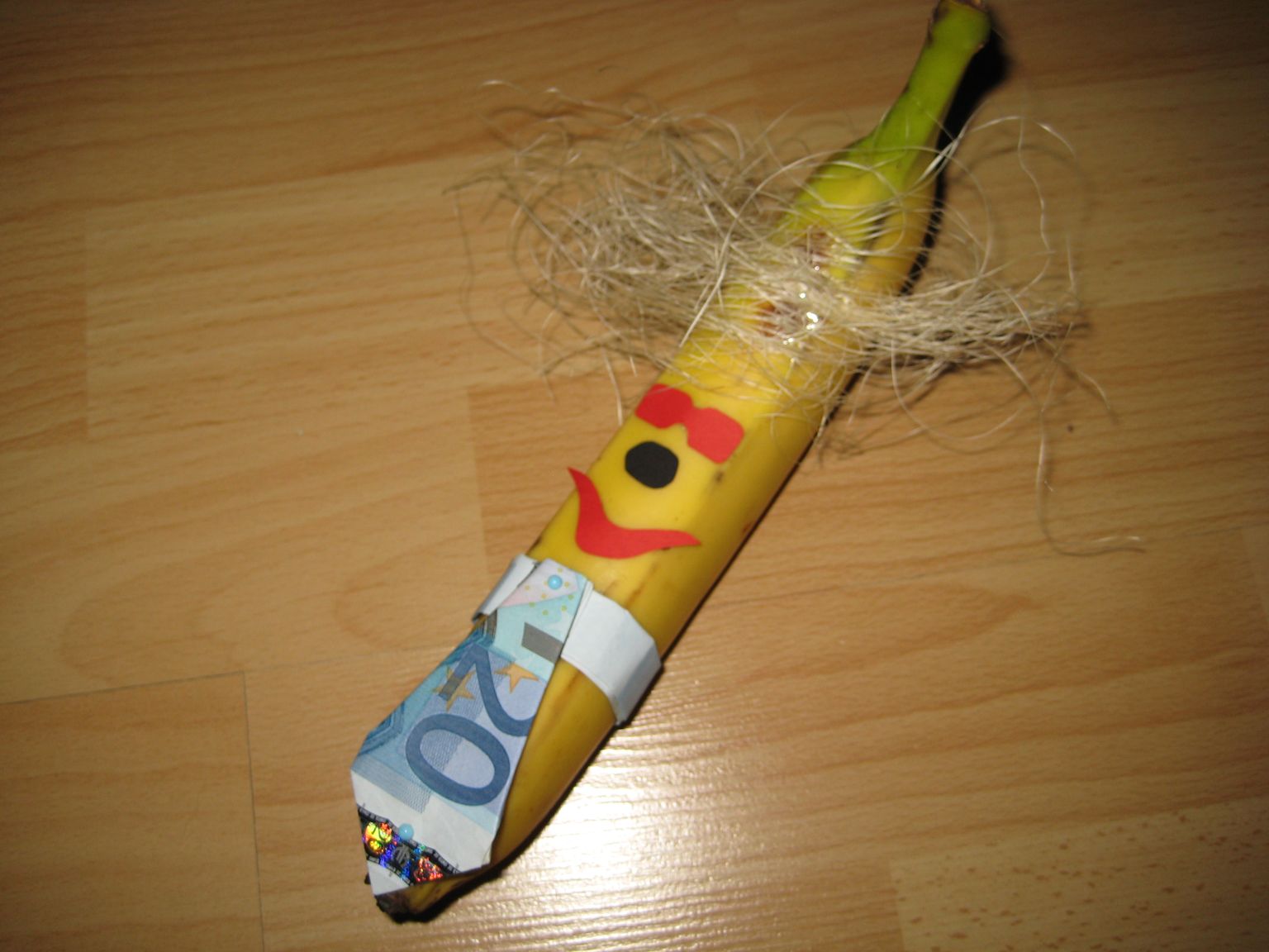 Dann wird der Geldschein gefaltet und oben an der Banane befestigt. Man kann alternativ auch einen Schlips falten und die Banane noch weiter dekorieren
