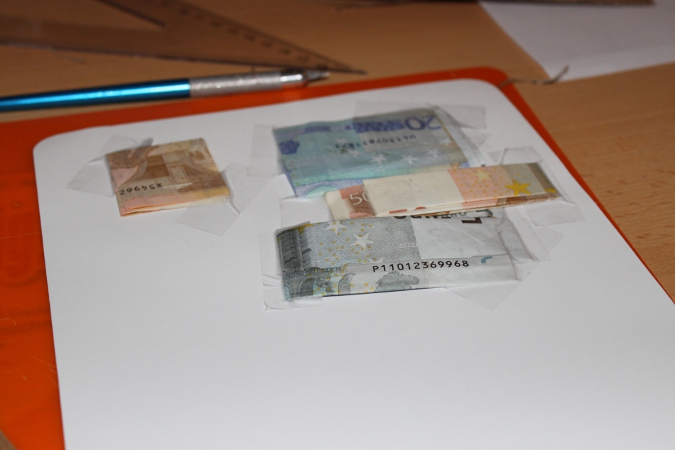 Ich hab dazu einfach das Logo meiner Geldapps genommen und einen Beschreibungstext aus dem Internet kopiert. In der Mitte habe ich ein paar Seiten freigelassen und das Geld eingeklebt.