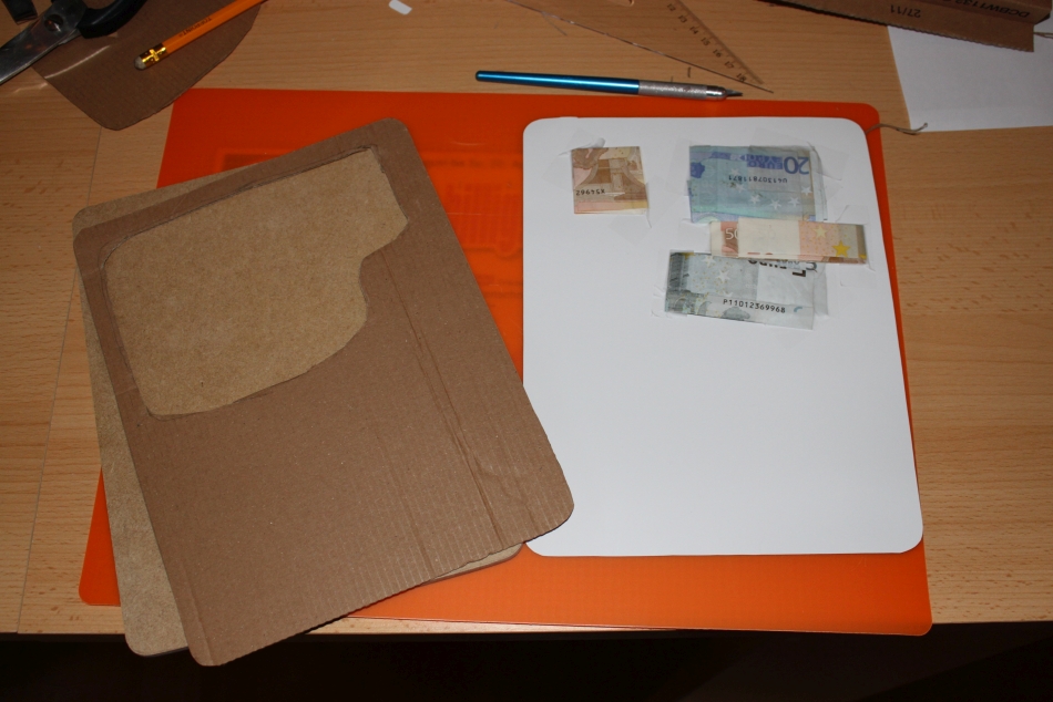 5. Da ich die Scheine etwas stärker gefaltet habe damit alles passt, habe ich noch ein Stück Karton auf die Größe des iPads zugeschnitten und an der Stelle wo die Geldscheine sind ein Loch reingeschnitten. Dann wird das Ganze zusammengeklebt und anschließend auf das Brett geklebt.