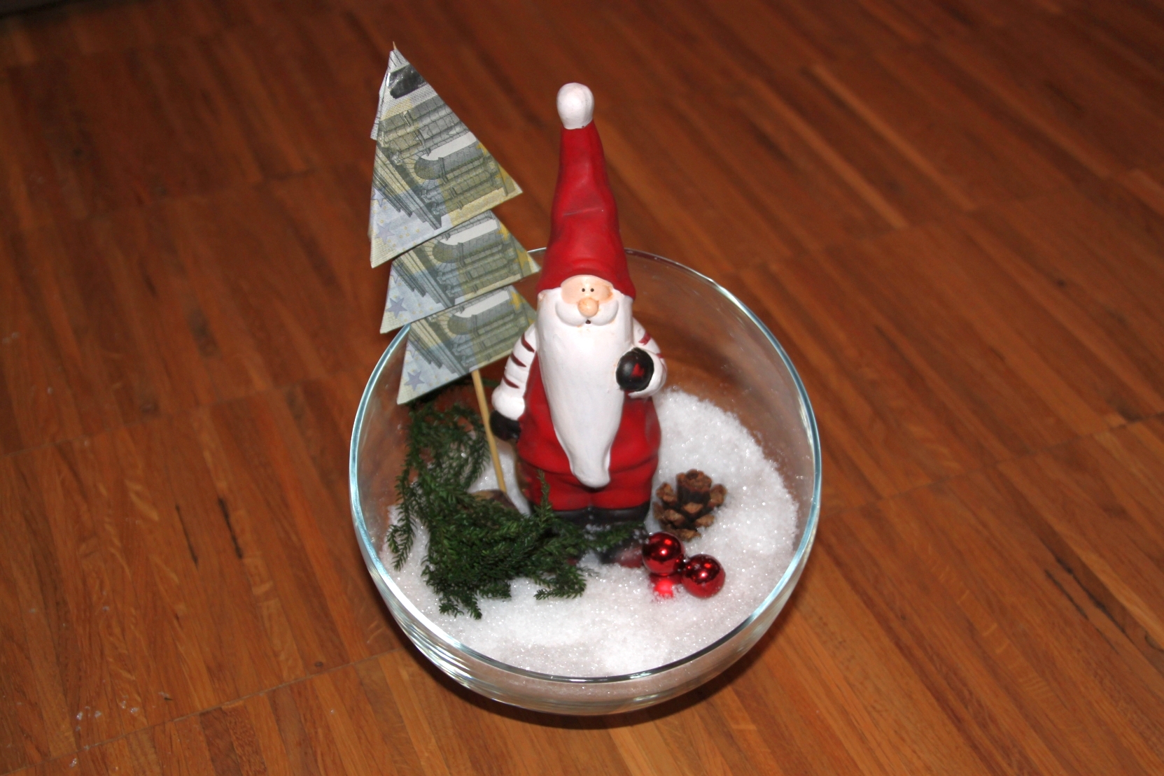 Fertig ist die Geldtanne. Man kann die Tanne selbst auch noch dekorieren, wenn man möchte.
