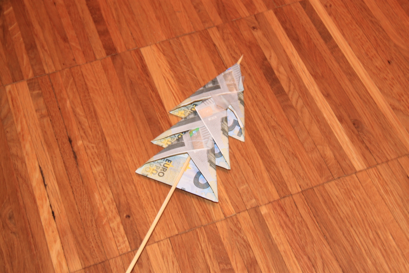 jetzt die drei Geldscheine auf den Schaschlikspieß stecken und passend ausrichten. Anschließend mit Tesafilm fixieren